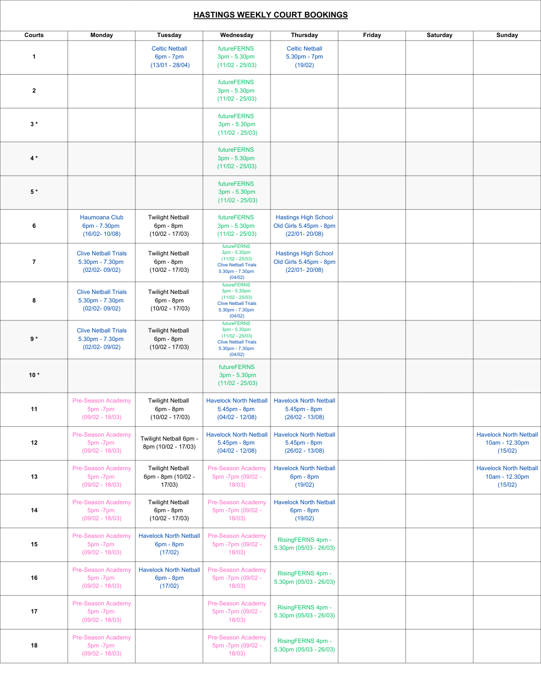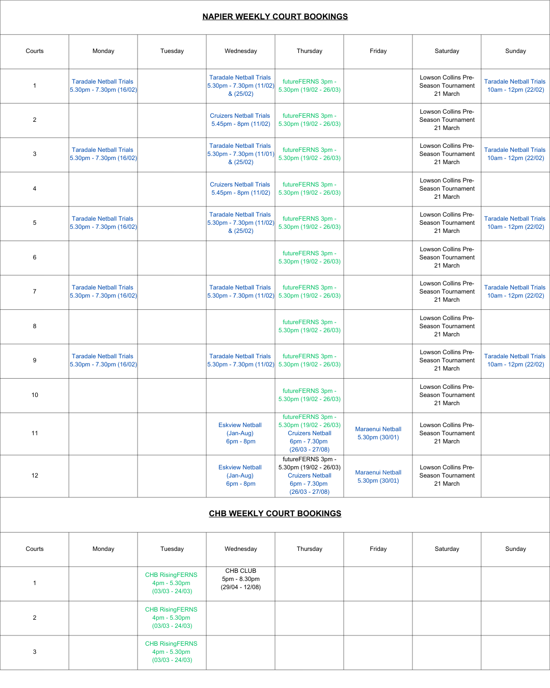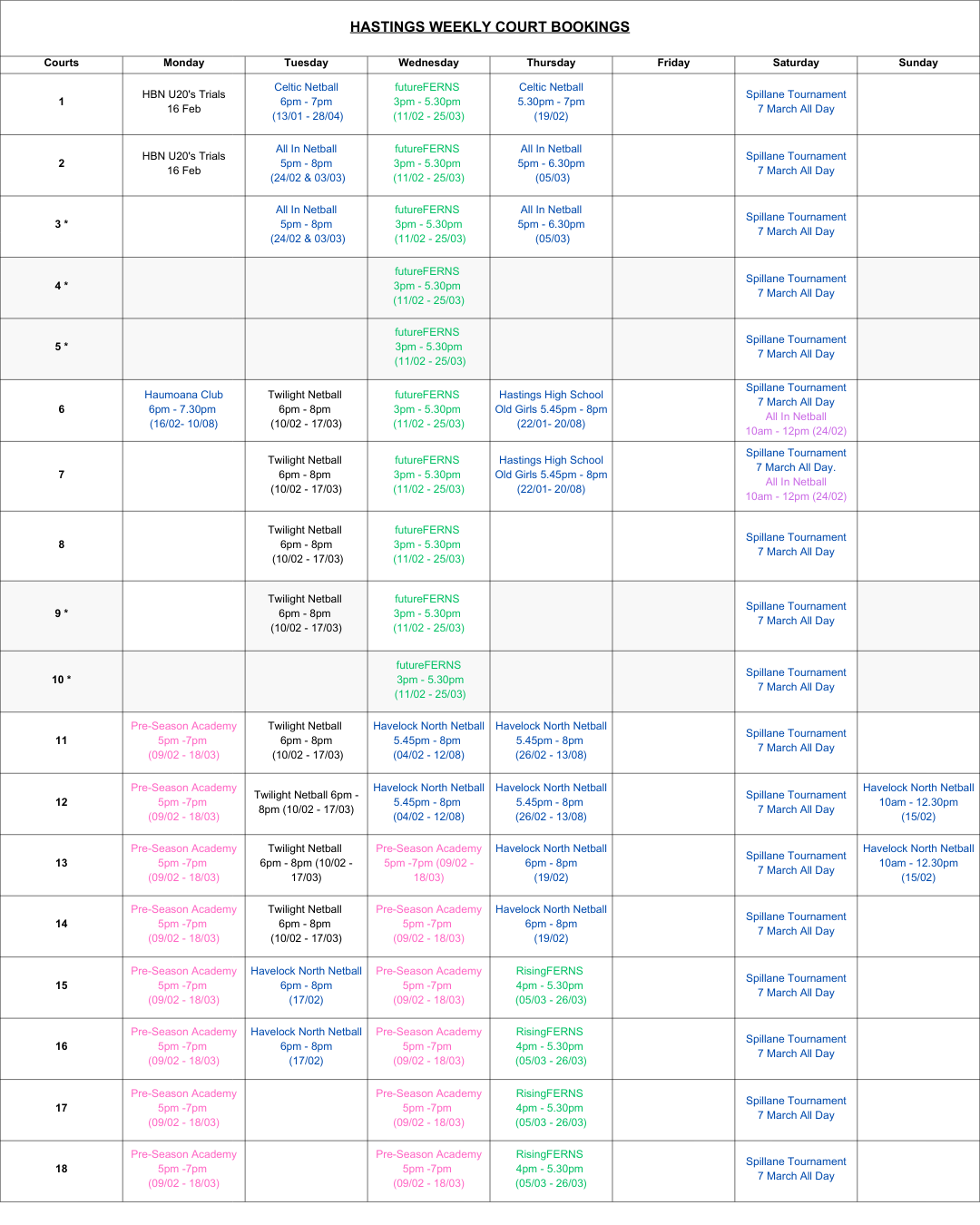 Please see Court Booking Availability below for Hastings, Onekawa and CHB.