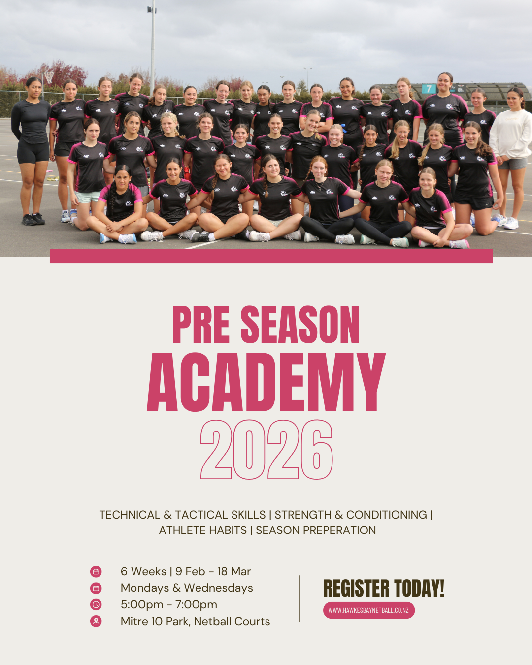 The Hawke’s Bay Netball Academy is designed for all Secondary School players who are committed to improving their fitness, strength, technical skills, and overall game understanding. This programme is ideal for players wanting to take their game to the next level and prepare for the upcoming season.